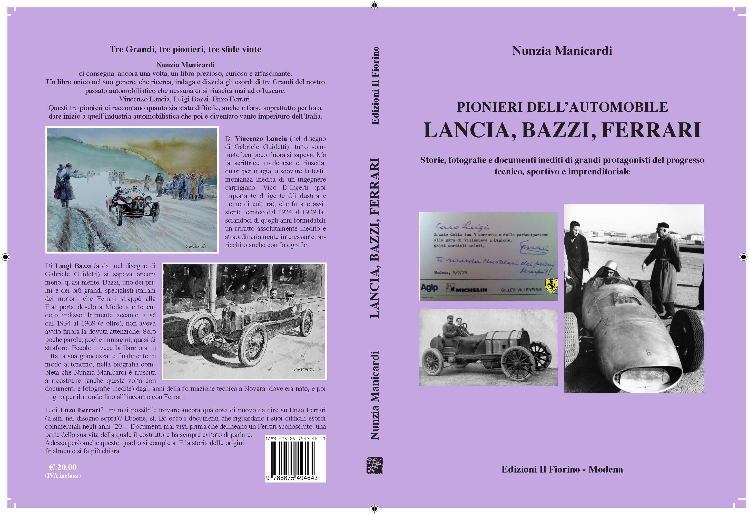 Nunzia Manicardi ci consegna ancora una volta un libro unico nel suo genere, prezioso, curioso e affascinante, con centinaia di storie ed eccezionali fotografie e documenti inediti di Vincenzo Lancia, Luigi Bazzi ed Enzo Ferrari e di piloti, tecnici e costruttori dagli anni ’10 e ’20 in poi. Un libro attualissimo, che in questo difficile momento ci permette di riflettere sull’origine dell’industria automobilistica italiana partendo da questi grandi Pionieri, tre protagonisti del progresso tecnico, sportivo e imprenditoriale nazionale e mondiale. Il libro dimostra inoltre quanto sia stato difficile anche per loro dare inizio a quell’automobilismo diventato vanto immortale dell’Italia nonostante la crisi presente.