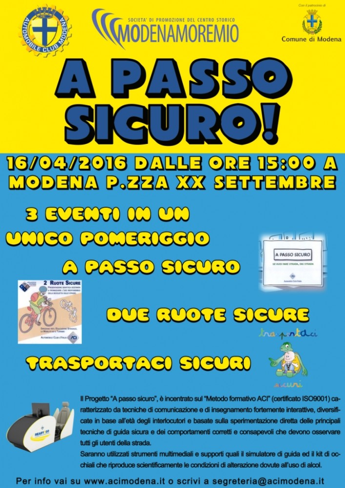 L’ Automobile Club Modena, in collaborazione con la Società di promozione del Centro Storico Modenamoremio, e con il patrocinio del Comune di Modena, ha realizzato un metodo formativo caratterizzato da tecniche di comunicazione e di insegnamento fortemente interattive, diversificate in base all’età degli interlocutori e basate sulla sperimentazione diretta delle principali tecniche di guida sicura e dei comportamenti corretti e consapevoli che devono osservare tutti gli utenti della strada.